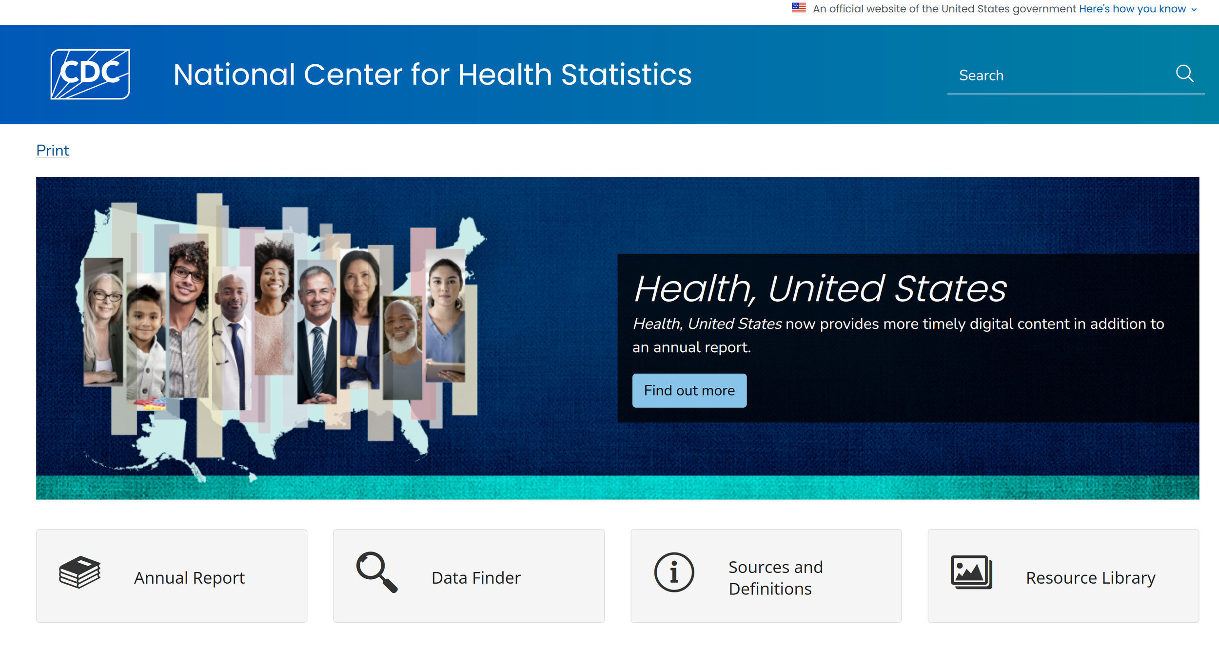 Health, United States from the National Center for Health Statistics at the Centers for Disease Control and Prevention provides national trends in health statistics.
