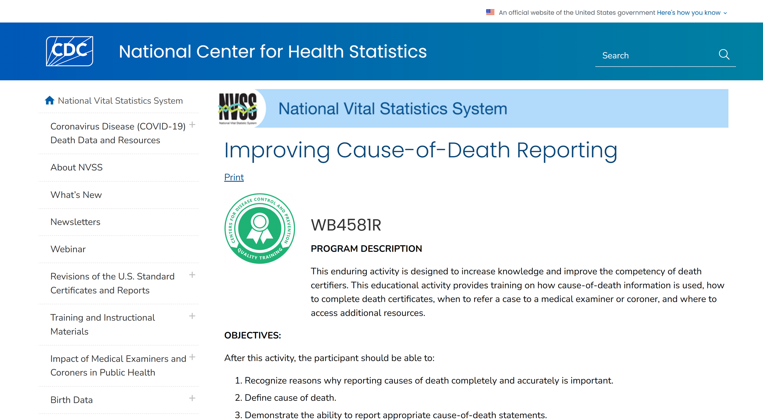 Improving Cause of Death Reporting is the official training for anyone who certifies deaths in the United States — physicians, medical examiners, coroners, nurse practitioners, physician assistants, funeral directors, and local health officials. The course is accredited for continuing education credits and hosted on CDC TRAIN.