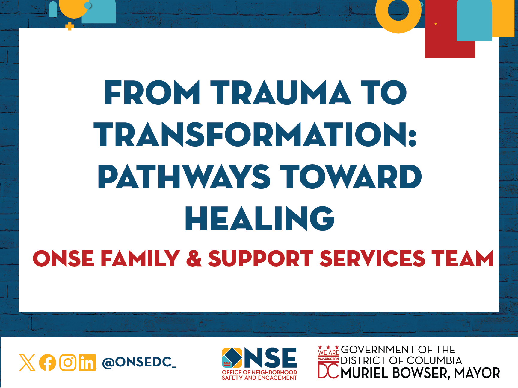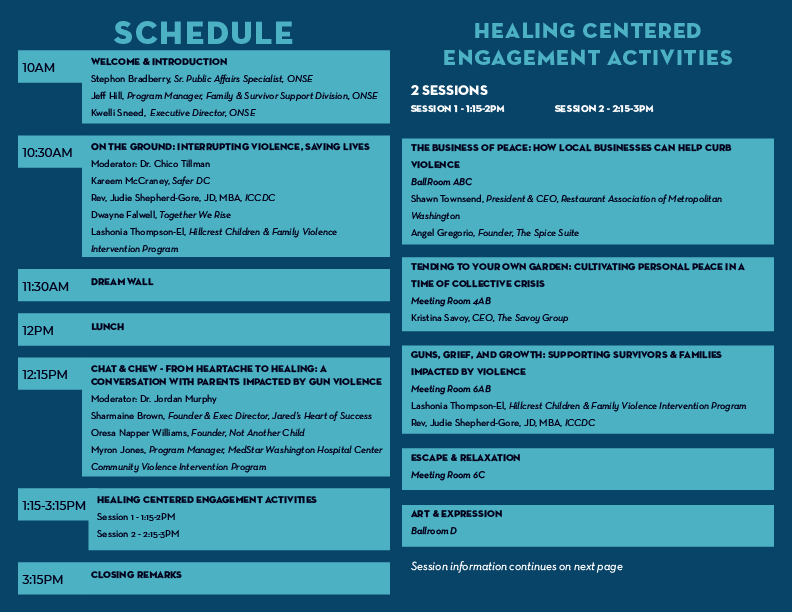 The first symposium had been designed in orange, the color associated with gun violence awareness. But for year two, ONSE wanted something different: a visual system rooted in the organization's own brand colors (navy, light blue, red, yellow) that could be reused and built upon for future events. The design needed to feel official enough for a DC government agency while creating an atmosphere of healing rather than heaviness.