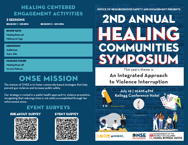 The Office of Neighborhood Safety and Engagement (ONSE) was hosting their 2nd Annual Healing Communities Symposium — a day-long event bringing together community leaders, survivors, and violence intervention practitioners. The theme was "An Integrated Approach to Violence Interruption," with sessions ranging from panel discussions with parents impacted by gun violence to sound baths and meditation.